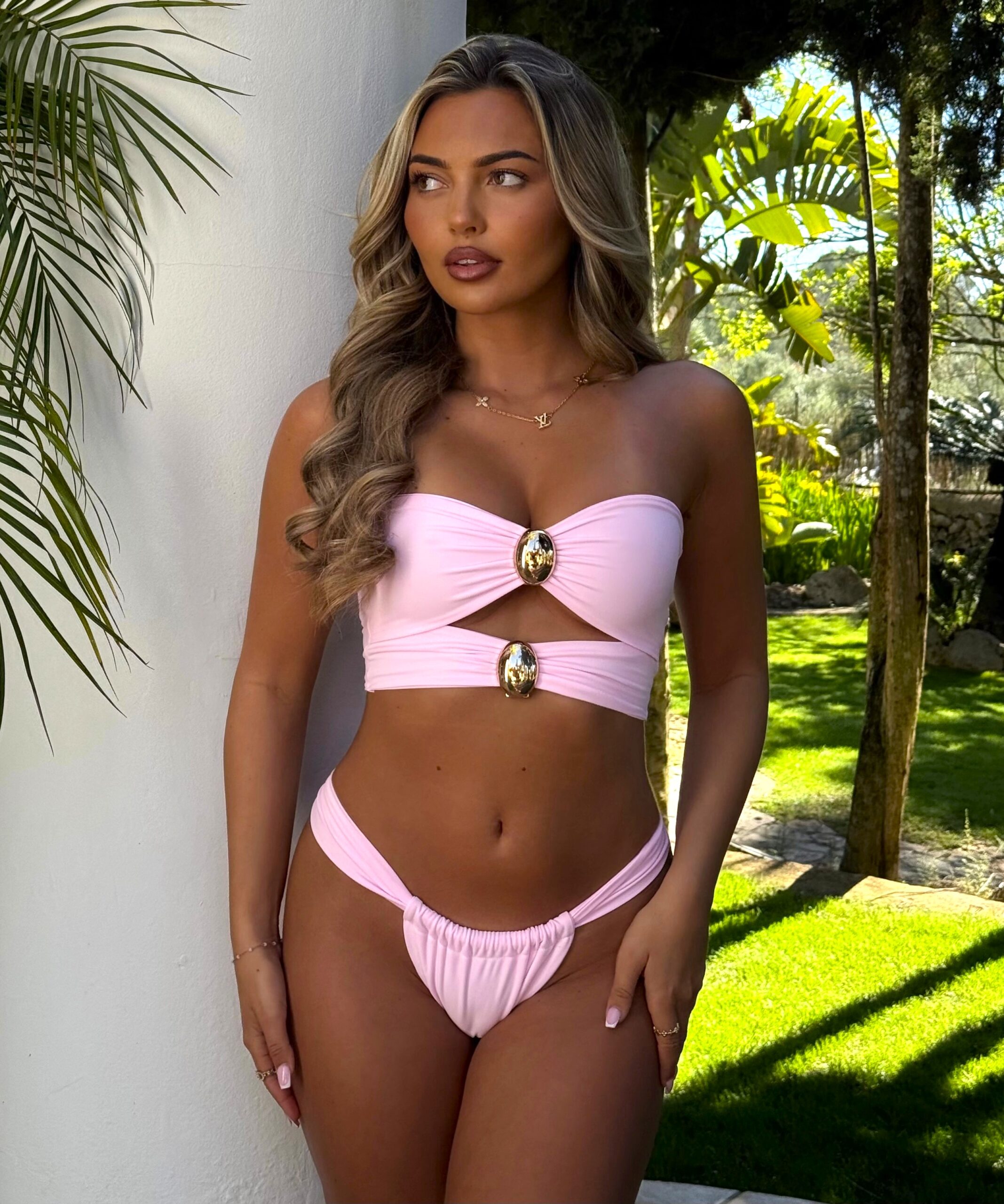 An adjustable, double layered Bikini featuring luxe gold hardware.